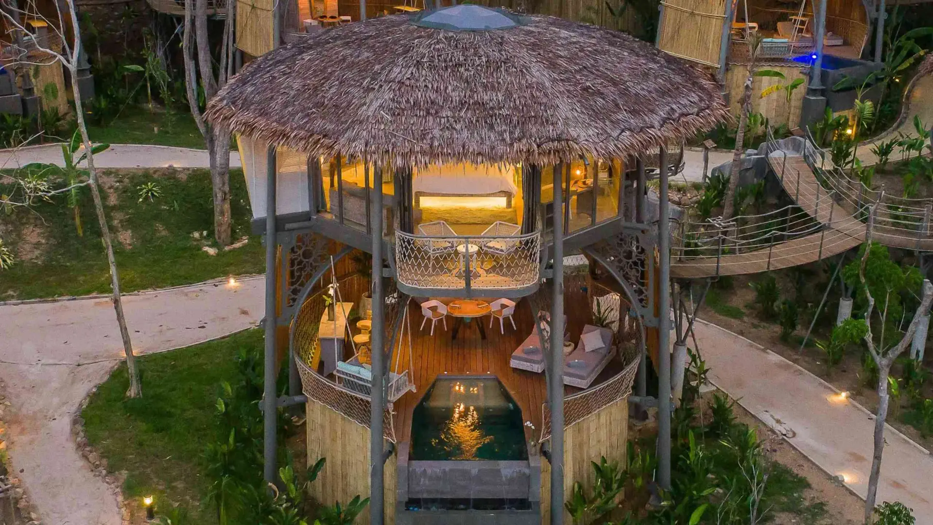 Guests traverse a wooden suspension bridge to reach the Treehouse villas, which stand two-stories tall and are just steps from the beach. The open-air lower level features a plunge pool, dining room, bar, day bed and double swing. The second floor feels like it’s a part of the surrounding jungle canopy with views out to Phangan Bay and features a king-size bed, ensuite bath with jungle shower, second bar and day bed. The resort also offers a beachfront and hilltop villa for those wishing for an upgraded experience.